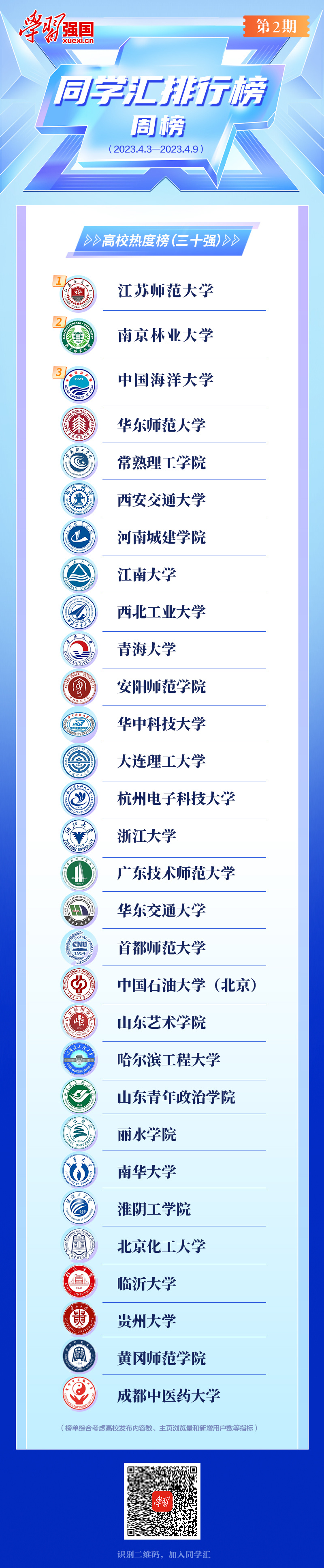 本网讯 4月14日,“学习强国”学习平台发布了《同学汇排行榜|高校热度榜第2期》,我校学习强国同学汇入选全国三十强。