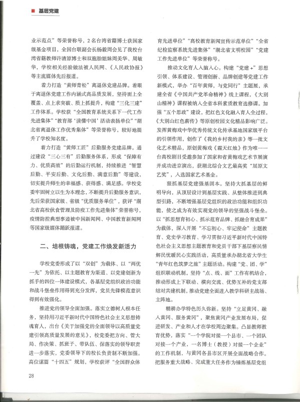 本网讯 “七一”前夕,中共湖北省委组织部、中共湖北省委党的建设工作领导小组办公室主办的《湖北党建》(2023年第3期)刊发校党委书记陈向军署名文章《立足“一融双高”党建引领构建多领域党建体系,以高质量党建引领高水平师范大学建设》。文章从“举旗定向,党建引领绘就学校事业发展新篇章”“培根铸魂,党建工作焕发新活力”“聚力赋能,党建融合彰显新高度”等三个方面,回顾总结我校开展党建工作的经验做法,全面展示我校党建工作新成效,以高质量党建推动学校事业高质量发展,以更高质量的美好黄师建设成效,为强国建设、民族复兴伟业贡献新的更大力量!