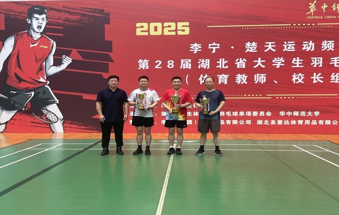 本网讯 7月12-13日,由湖北省学生体育协会举办的第28届湖北省大学生羽毛球锦标赛(体育教师、校长组)在华中师范大学佑铭体育馆举办。我校代表队荣获校长杯第五名、教师组团体冠军。